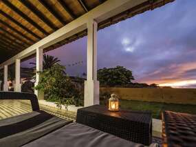 Die Terrasse ist überdacht und Sie haben einen herrlichem Blick aufs Meer. Verbringen Sie hier erholsame Stunden mitten im Grünen.