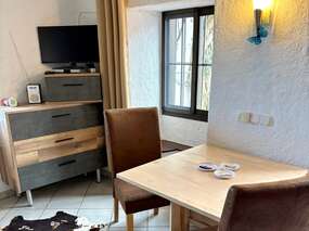 Die kleine Küchenzeile ist mit Mikrowelle, Elektroherd, Wasserkocher, Kaffeemaschine, Kühlschrank und allen notwendigen Kochutensilien ausgestattet. Im modernen Badezimmer stehen Ihnen eine Dusche mit Vorhang, ein WC sowie ein Waschbecken mit Stauraum und Spiegel zur Verfügung. Für kühlere Tage ist eine Fußbodenheizung vorhanden.