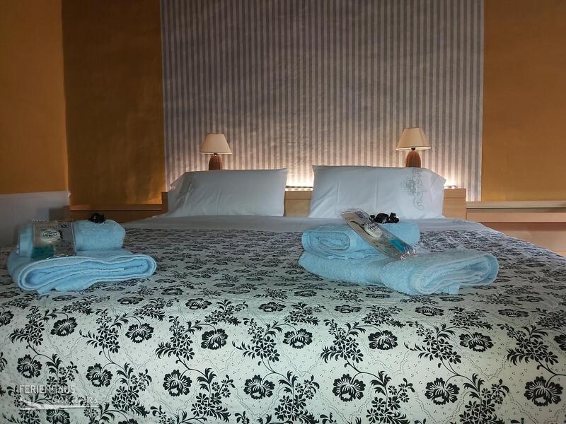 Die Wohnung hat 1 Schlafzimmer mit Doppelbett, Wohnraum mit Schlafsofa und Küchenzeile und ein Bad. Das Schlafzimmer ist mit liebevollem Charme eingerichtet und geräumig. Das Bad ist mit Dusche (mit Hydromassagefunktion), Waschbecken, WC, Fön und Bademänteln.