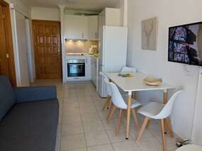 In allen Wohnungen finden Sie ein Schlafzimmer, je nach Wohnung mit mit einem Doppelbett oder 2 Einzelbetten sowie ein Schlafsofa im Wohnraum. Die Küchenzeile ist unter anderem mit Mikrowelle, 2 Platten-Kochfeld, Kaffeemaschine und einem Kühlschrank mit Gefrierfach ausgestattet.