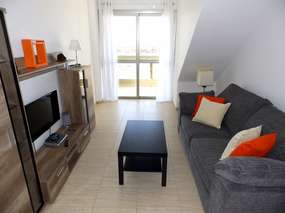 Der modern und hell eingerichtete Wohnbereich beinhaltet ein bequemes Sofa mit Sofatisch, Fernseher (SAT-TV), Schränke und eine Essecke mi Tisch und 4 Stühlen. Die Küche ist für Selbstverpfleger eingerichtet und hält ein Ceranfeld samt Backofen, Mikrowelle, Kaffeemaschine und weitere Utensilien zum Kochen und Verzehr bereit.
