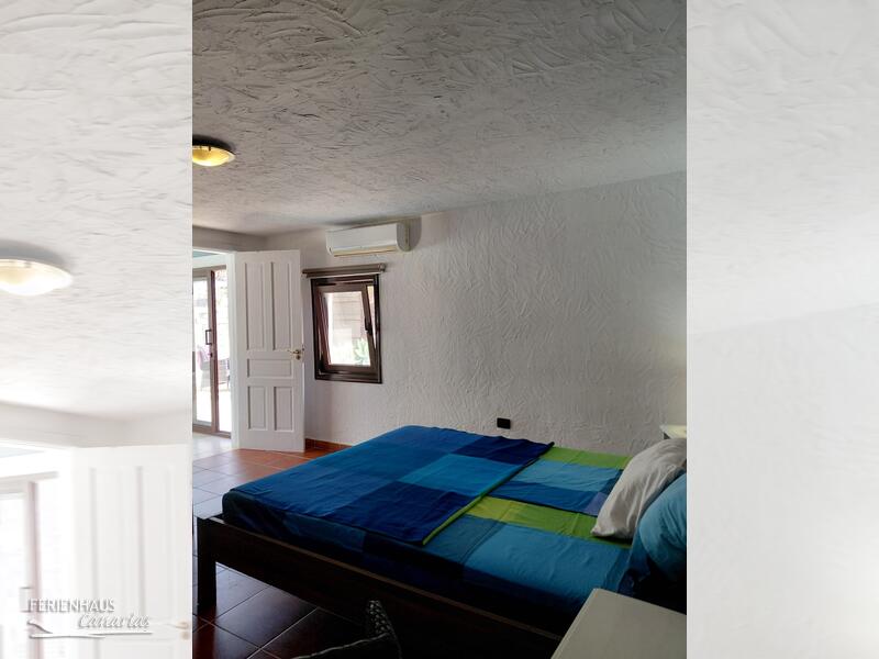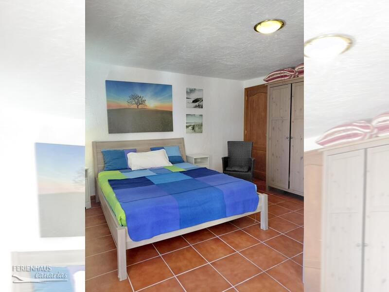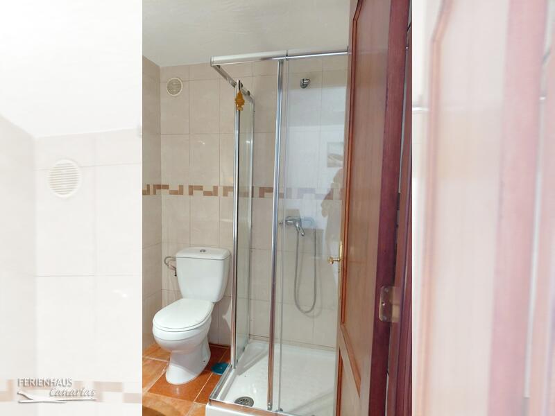 Das Schlafzimmer ist mit einem Doppelbett und zwei Schränken eingerichtet. Das angeschlossene Badezimmer verfügt über eine Dusche, WC und Waschbecken. Eine zweite Toilette sowie eine Waschmaschine sind vom Eingangsbereich aus zugänglich.