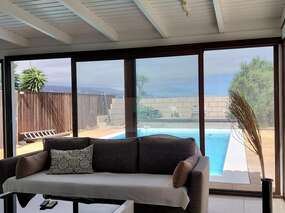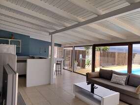 Der großzügige Wohn-Essbereich ist mit einem ausziehbaren Sofa, Sat-TV und einer offenen Küche ausgestattet. In der Küche finden Sie alles, was Sie für den Alltag brauchen: ein Ceran-Kochfeld, einen großen Kühlschrank mit Gefrierfach, eine Kaffeemaschine sowie alle wichtigen Küchenutensilien. Vom Wohnzimmer aus blicken Sie direkt auf den Pool.