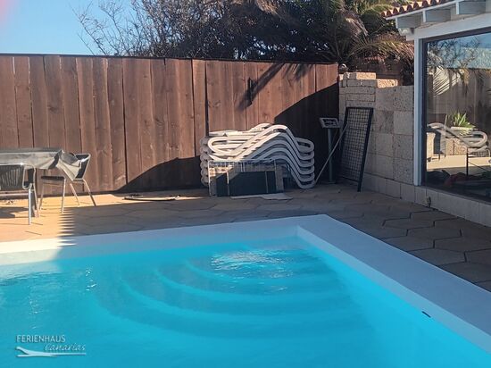 Zur Finca gehört ein großer Pool (ca. 6 × 12 m), den Sie an sich für sich allein genießen können. Auf der angrenzenden Terrasse stehen Sonnenliegen und Gartenmöbel bereit – perfekt für gemütliche Stunden an der frischen Luft.