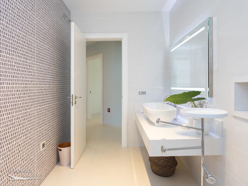 In der unteren Etage bieten Wohn- und Esszimmer ebenfalls Meerblick, die Küche verfügt über hochwertige Geräte und moderne Ausstattung. Das Schlafzimmer auf der unteren Etage verfügt über ein Doppelbett und bietet Zugang zur Terrasse. Auf dieser Etage gibt es zudem ein Badezimmer.
