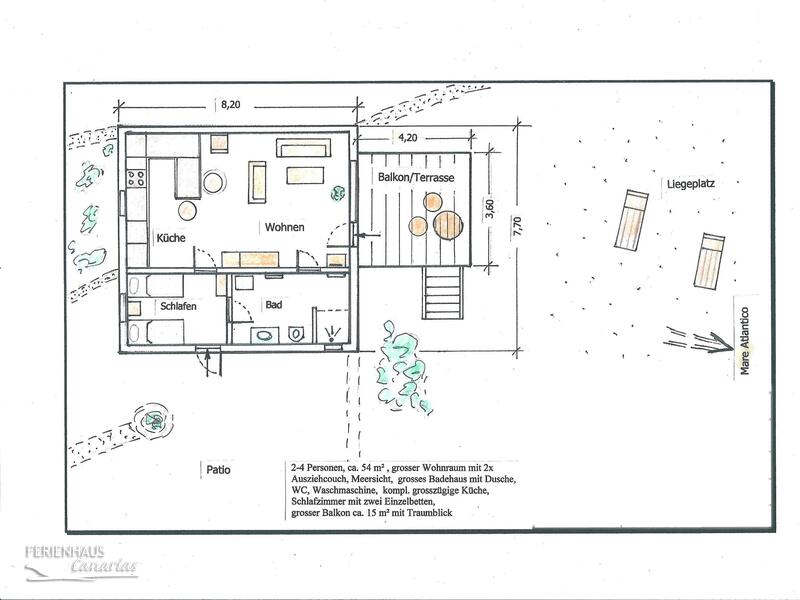 Das Ferienhaus verfügt über einen Wohnraum mit offener gut ausgestatteter Küche, Flachbildfernseher und Zugang zur Terrasse. Sowohl vom Wohnraum als auch von der Terrasse eröffnet sich ein wunderschöner Ausblick auf den Atlantik. Die Terrasse ist teilweise verglast (Windschutz).