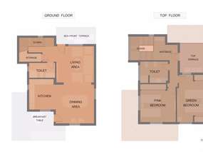 Die Wohnfläche von 130m² verteilt sich auf zwei Ebenen: Im Erdgeschoss befindet sich ein großer Salon (Wohnzimmer), das Esszimmer, die Wohnküche und ein Bad. In der oberen Etage sind die beiden Schlafzimmer und ein weiteres Bad, sowie eine Terrasse, auch mit Blick aufs Meer.