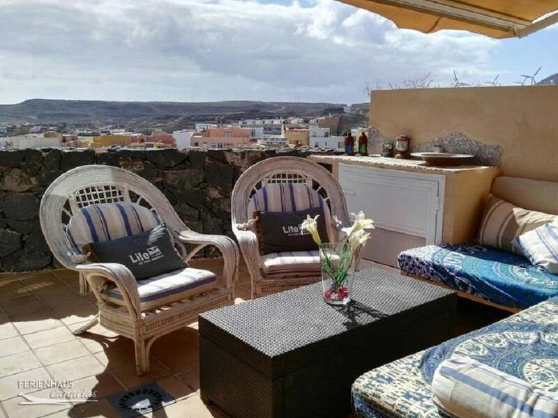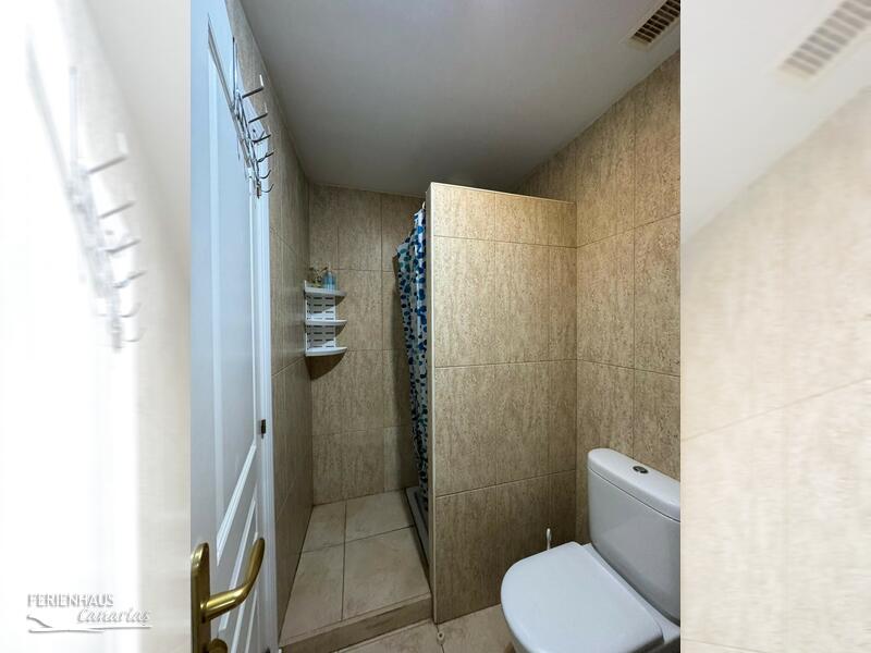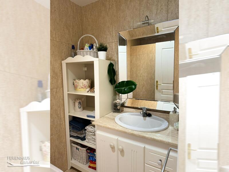 Ein kleiner Wirtschauftsraum mit Waschmaschine und ein Patio, wo man z. B. Wäsche aufhängen kann, schließen an die Küche an.Im Badezimmer der Ferienwohnung in Teneriffa Süd erwarten Sie eine Dusche, Waschbecken und WC, sowie Handtücher und Föhn.