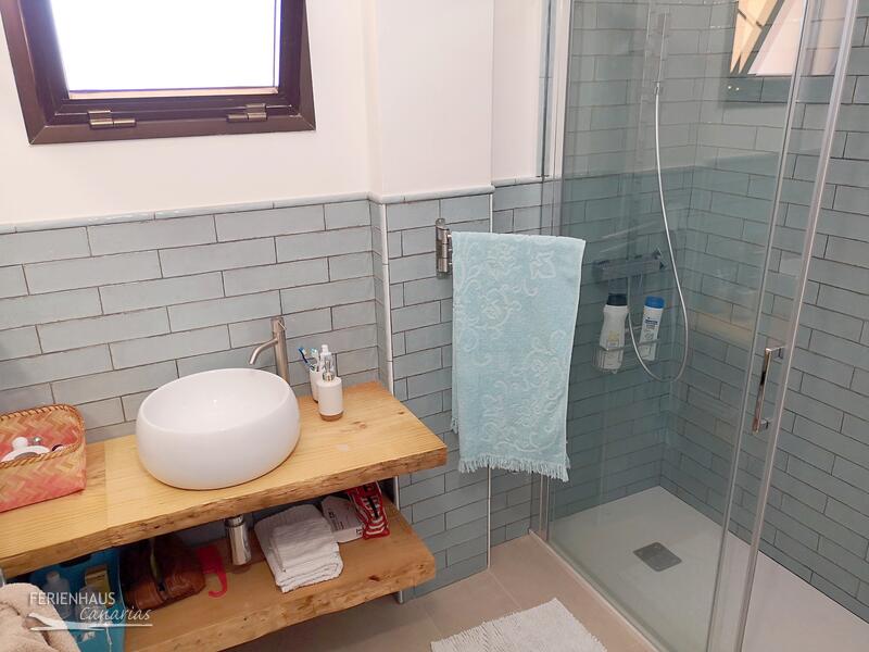 In dem oberen Stockwerk finden Sie zwei Schlafzimmer. Das eine Schlafzimmer hat einen großen Schrank sowie einem Doppelbett. Das zweite Schlafzimmer ist ausgestattet mit einem großen Einbauschrank und zwei Einzelbetten. Des Weiteren gibt es in dieser Etage ebenfalls ein Badezimmer mit WC und einer Dusche. Außerdem gibt es im oberen Stockwerk eine Sonnenterrasse mit Meehrblick und dem Wind abgewendet.