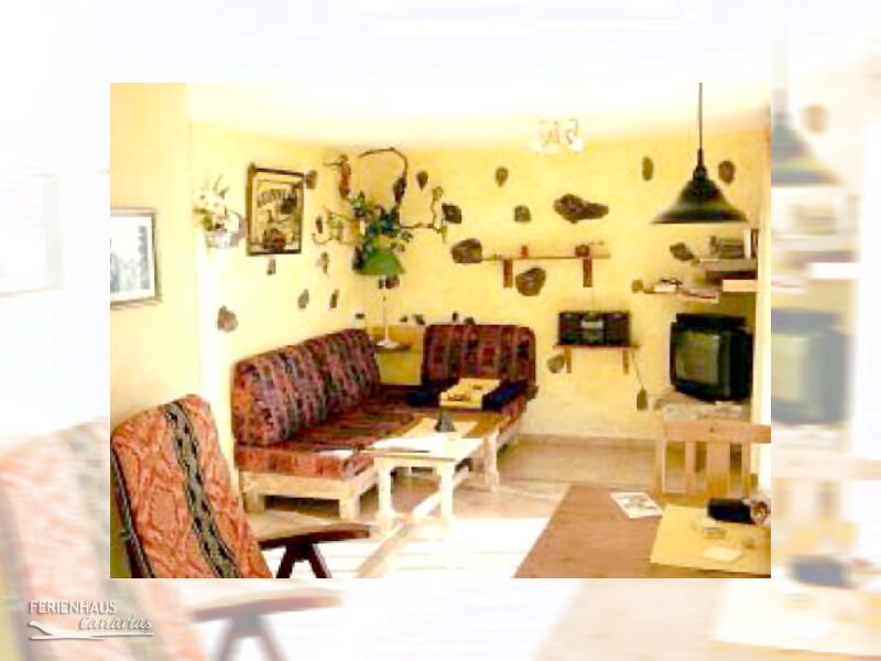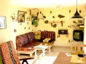 Das Wohnzimmer verfügt über eine Couchgarnitur, Sat-TV, Radio mit CD-Player und Kassettenrekorder sowie viele Bücher. Des Weiteren hat es einen Zugang zur 15m² großen Holzterrasse.