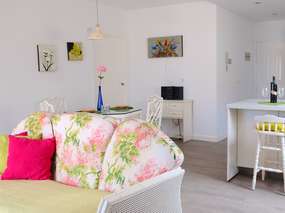 Die Einrichtung ist in hellen und sonnigen Farben gehalten. Im Wohnzimmer stehen gemütliche Sofas und das Fernsehgerät wurde an eine Satelliten-Antenne angeschlossen. So können auch einige deutsche Programme empfangen werden.