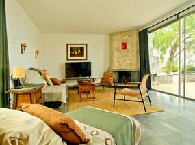 Im Haus finden Sie einen großzügigen hellen Wohnraum, welcher stilvoll eingerichtet ist. Warme Farben und unterschiedliche Materialien sowie die Kombination aus Vintage und modernem Mobilar sorgen für eine freundliche Wohlfühlatmosphäre. Das Wohnzimmer verfügt über eine Couch, 2 Sessel sowie eine Chaiselongue von wo aus Sie TV schauen, die Aussicht nach draußen in den Garten genießen oder bei einem warmen Kaminfeuer entspannen können.