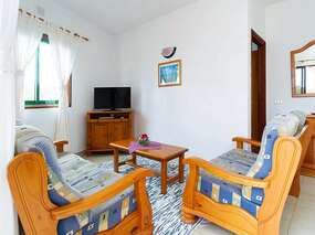 Auf ca. 53m² verteilen sich 1 Schlafzimmer mit Doppelbett, 1 (Kinder-) Schlafzimmer mit 2 Einzelbetten (ohne Fenster), Wohnzimmer mit Sofa, Fernseher mit deutschen Programmen, Küche mit Essecke. Ausstattung Küche: Herd, Mikrowelle, Mixer, Batidora, Kaffeemaschine, Wasserkocher, Toaster. Das Badezimmer ist mit Badewanne, WC, Waschbecken und Föhn.
