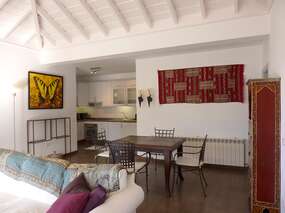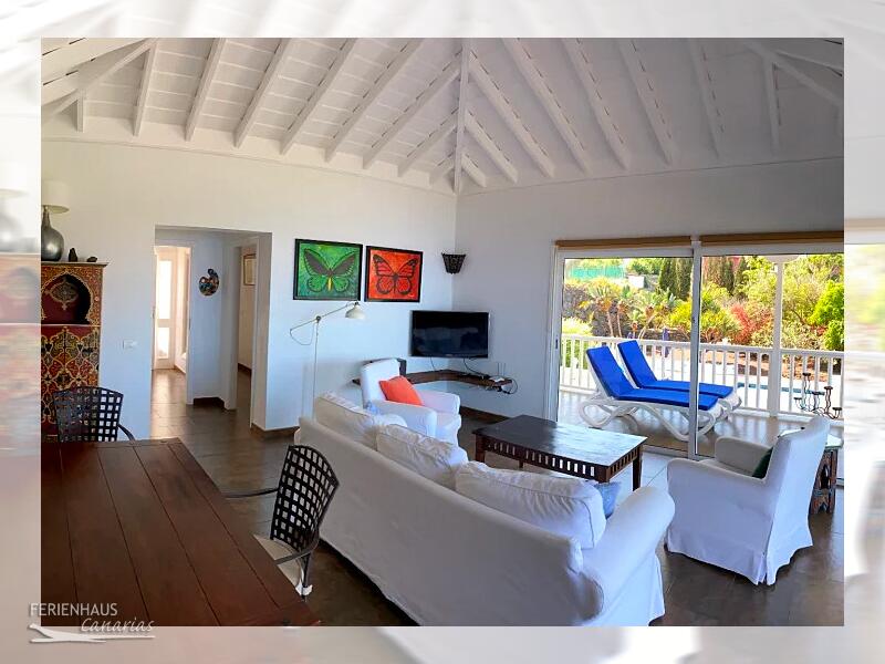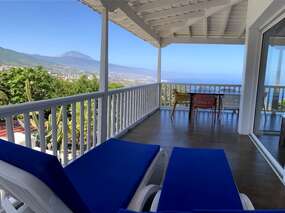 Sie wohnen im oberen Teil der Villa. Das komfortable Wohnzimmer mit Sitz- und Essecke bietet eine Traumhaftschöne Aussicht über die Nordküste, Orotavatal mit Teide und Puerto de la Cruz.