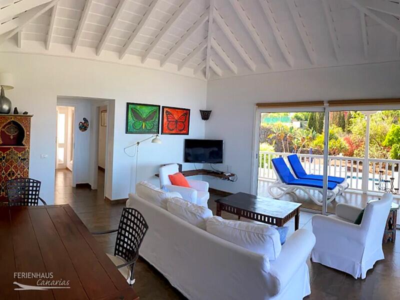 Der lichtdurchflutete Wohnraum mit einem wunderbaren Panoramablick ist unumstritten das Highlight dieses 180 m² Ferienhauses. Der Blick durch riesige Panoramafenster führt über die Nordküste, auf den Atlantik und auf den Teide. Ausgestattet ist dieses Wohnzimmer mit einer Couch, einem Flachbildfernseher und einem Essbereich. Die offene Küche ist komplett ausgestattet mit allem, was Sie im Urlaub benötigen. Unter anderem finden Sie dort eine Auswahl von 3 verschiedenen Kaffemaschinen (Nespresso, Filter, Senseo).