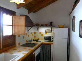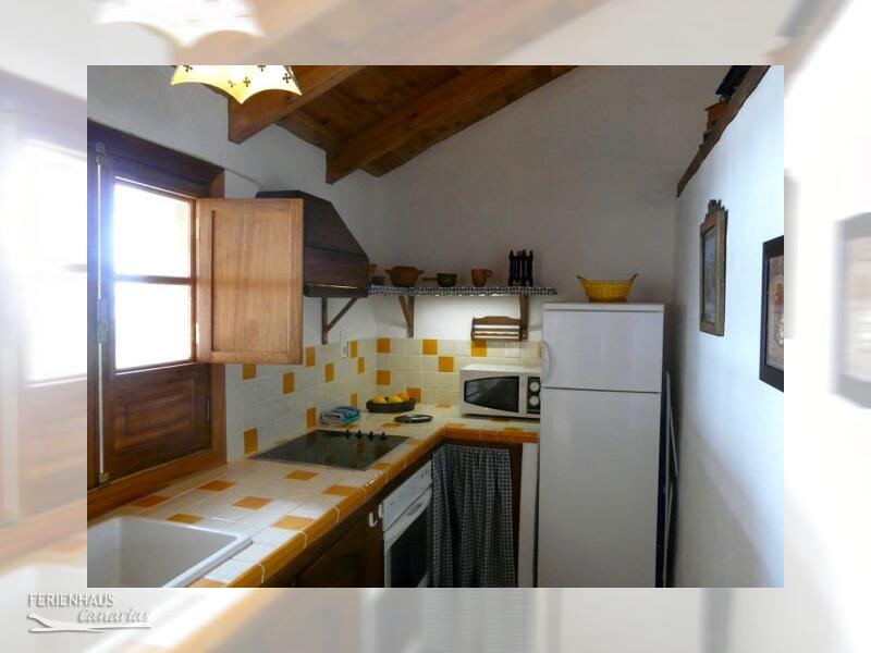 Das Wohnzimmer verfügt über eine Couch, sowie einen Flachbildfernseher mit SAT-Empfang und internationalen Sendern. Ebenfalls befindet sich dort ein Esstisch mit Stühlen. Die kleine Küche verfügt über alles was für einen angenehmen Urlaub gebraucht wird: Eine Mikrowelle, eine Gefrier-Kühlschrank-Kombination, ein Ceran-Kochfeld sowie ein Backofen. Ebenfalls gibt es einen Toaster, eine Kaffeemaschine und eine Waschmaschine.