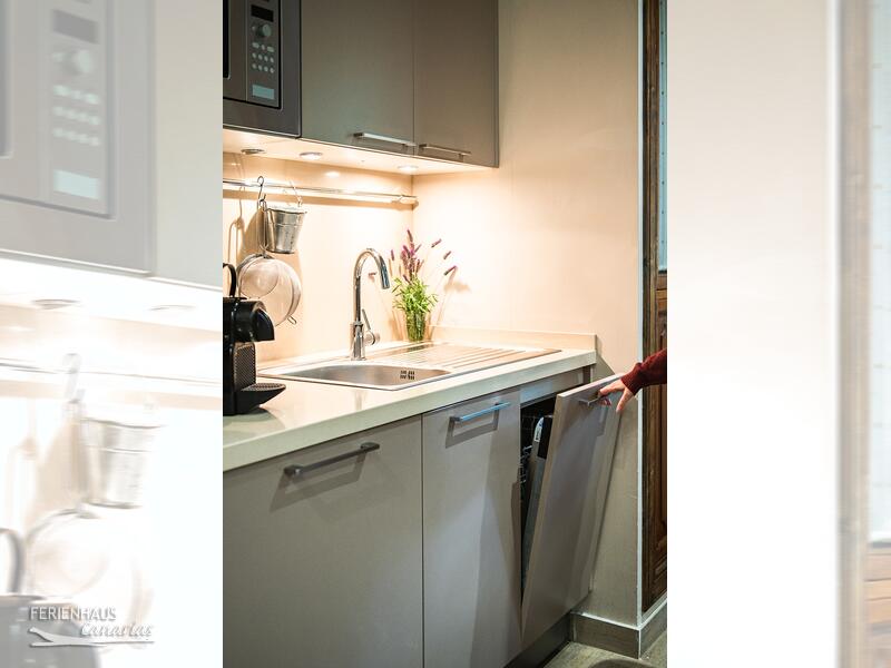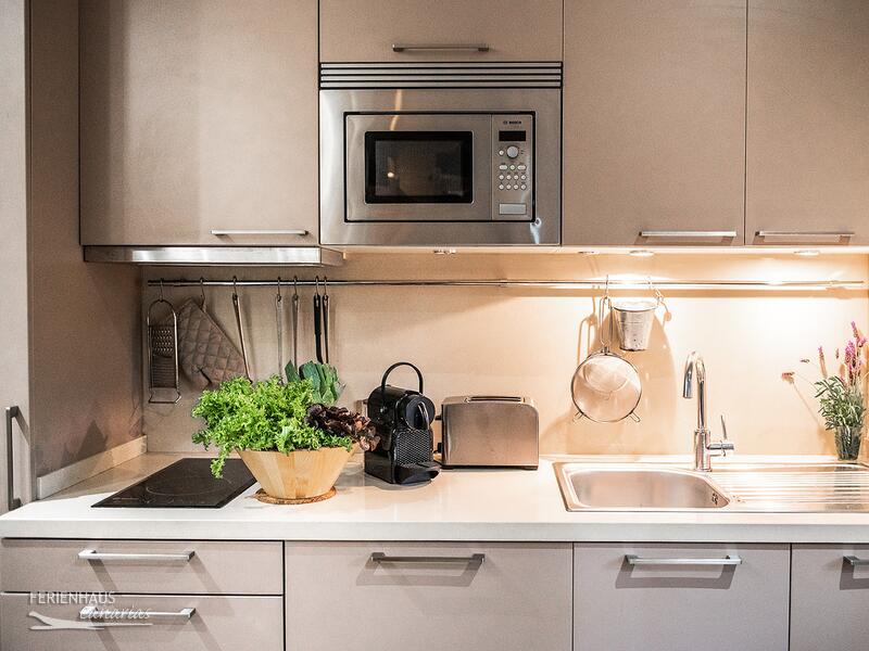 ✓ Modern ausgestattete Küchenzeile unter anderem mit: Mikrowelle, Wasserkocher, Mixer & weitere Kücheutensilien