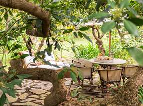 Auf dem Grundstück finden Sie lauschige Ruhezonen unter Bäumen, auf den Terrassen und im Garten mit Gartenmöbeln die alle Urlauber zum Relaxen einladen.
