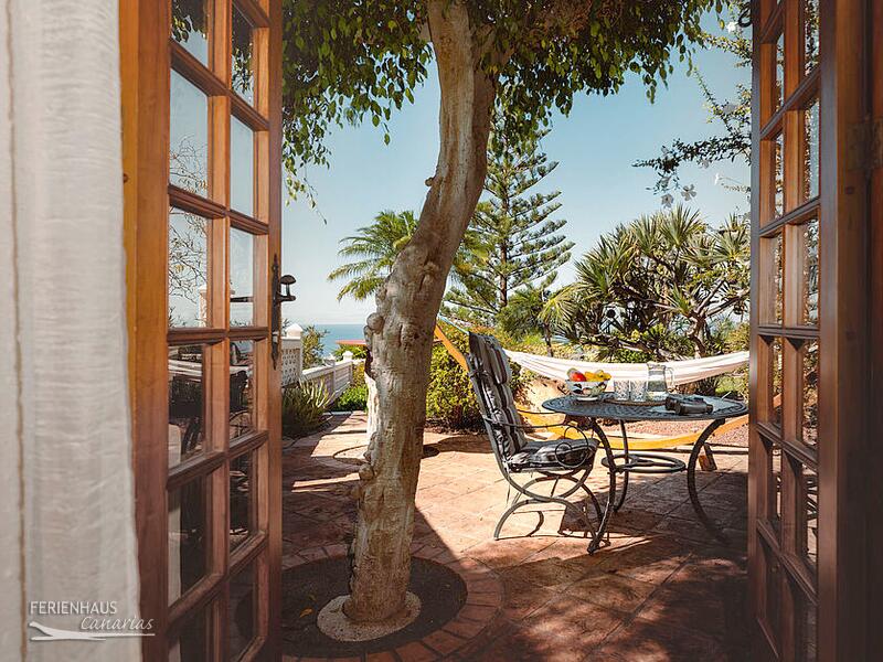 An der Rückseite der Ferienwohnung in La Matanza befindet sich die möblierte Terrasse und ein Wasserfall mit Biotop - ein lauschiges Plätzchen, welches zum Verweilen einlädt. Vom Garten aus können Sie ein außergewönliches Panorama auf das Meer mit seiner Vulkangesteinküste, den Teide und die Stadt Puerto de la Cruz erfahren.